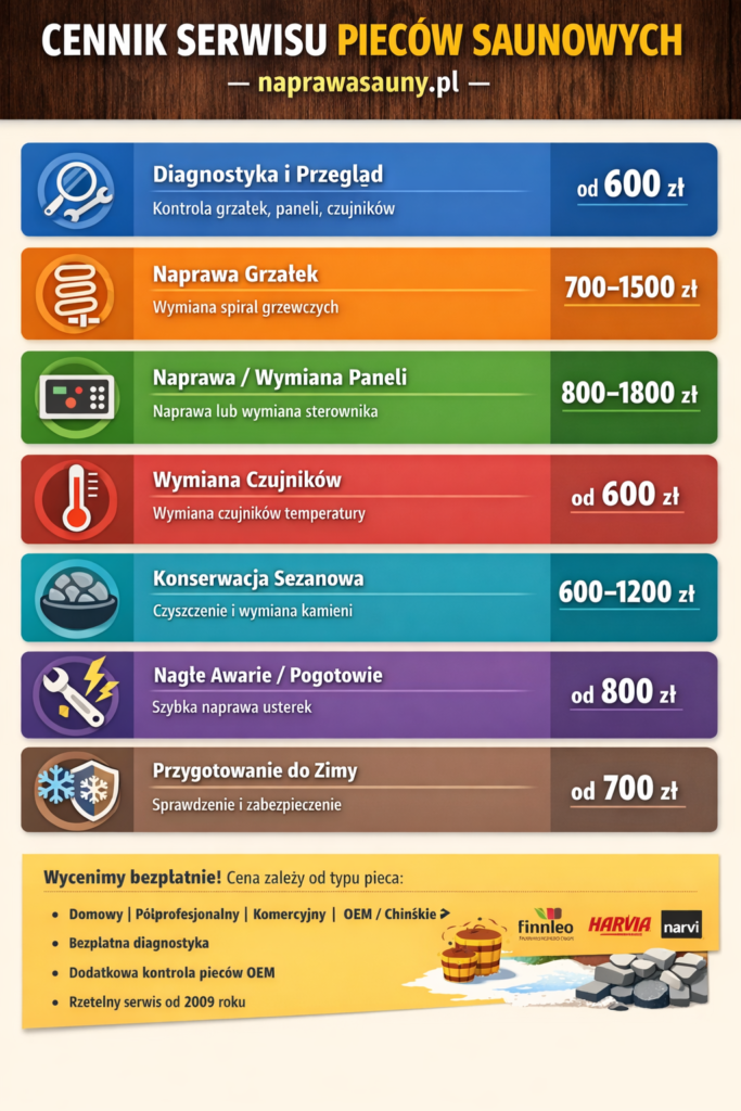 | Przegląd roczny sauny (domowej) | Diagnostyka + czyszczenie | 250–400 |